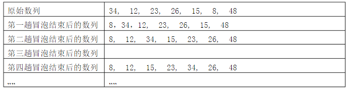 第 12 题 下表是对原始数列“34, 12, 23, 26, 15, 8, 48”进行从小到大样序的过程(采用冒泡排序),按照下表信息以及冒泡排序算法的思想,则表中第三趟冒泡结束时的数列应为( )